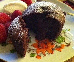 Since I was feeling ambitious, I also made dessert – molten chocolate cake – courtesy of another recipe I picked up during my cooking course at Ashburton. It’s a pretty straightforward recipe; the toughest part is nailing the cooking time. It can vary by several minutes depending on your oven, so it may take some trial and error. Don’t worry if you miss the mark the first time around and overcook them a bit – the result will be more cake and less molten, but it will still taste great.