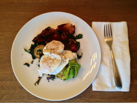 Poached eggs resting on some wilted kale and sauteed squash with a side of crispy bacon and creamy avocado. Sounds like a breakfast of champions!