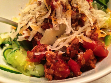 Maia & Pat Monday dinner ← Previous Next → Monday: Zucchini “pasta” with lamb sausage and tomato sauce. Maia experimented with zucchini “pasta” and topped it with lamb sausage in tomato sauce.